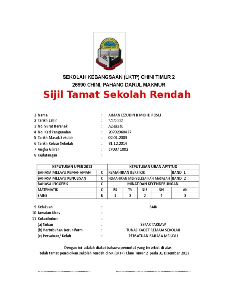 Sijil Tamat Persekolahan Sekolah Rendah Pdf