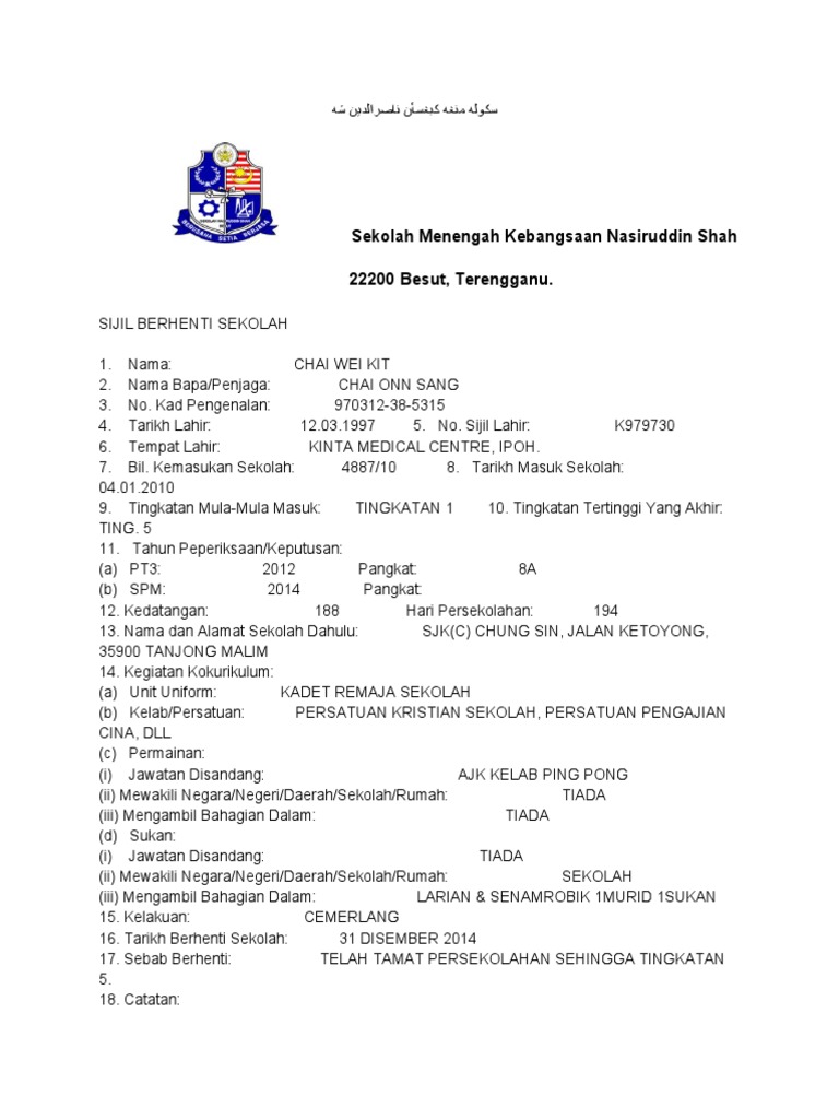 Contoh Sijil Berhenti Sekolah Pdf